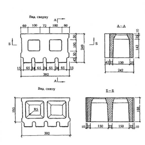 Камни для кладки стен КЛ-ПР-ПС 39,2. Унифицированные изделия, имеющие прямоугольную форму с рядом конструктивных особенностей в виде выступов, углублений и отверстий.